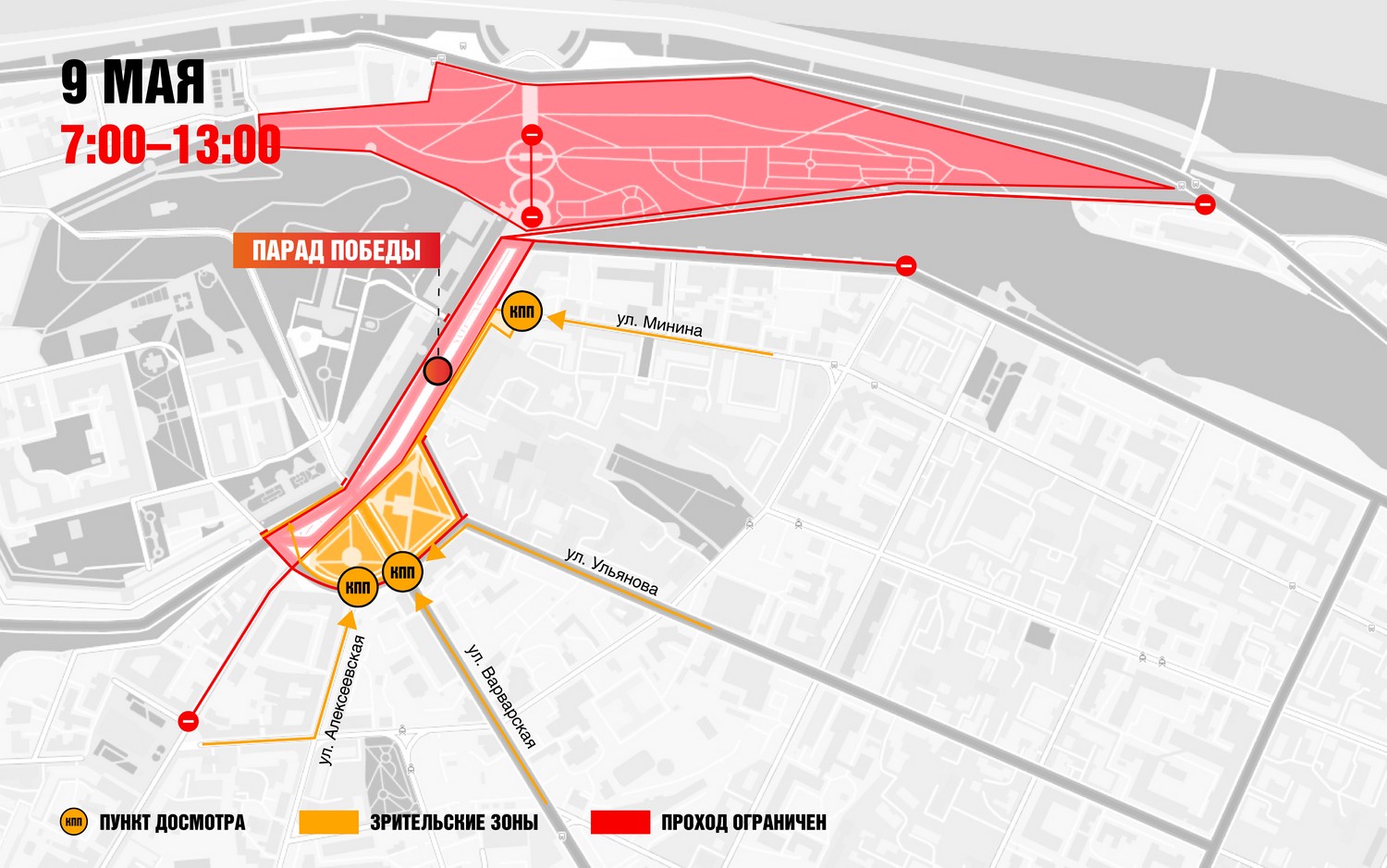 В 9.50 на центральной площади города начнется военный парад. Трансляцию парада можно будет посмотреть в эфире нижегородских телеканалов, а также на странице региона в социальной сети «ВКонтакте» (https://vk.com/governmentnnov). Обращаем внимание, что 9 мая доступ зрителей на площадь Минина и Пожарского и на Нижне-Волжскую набережную будет осуществляться в особом порядке (согласно представленным схемам в приложении). На парад Победы вход на площадь будет организован через три КПП: с улиц Минина, Варварской и Алексеевской.