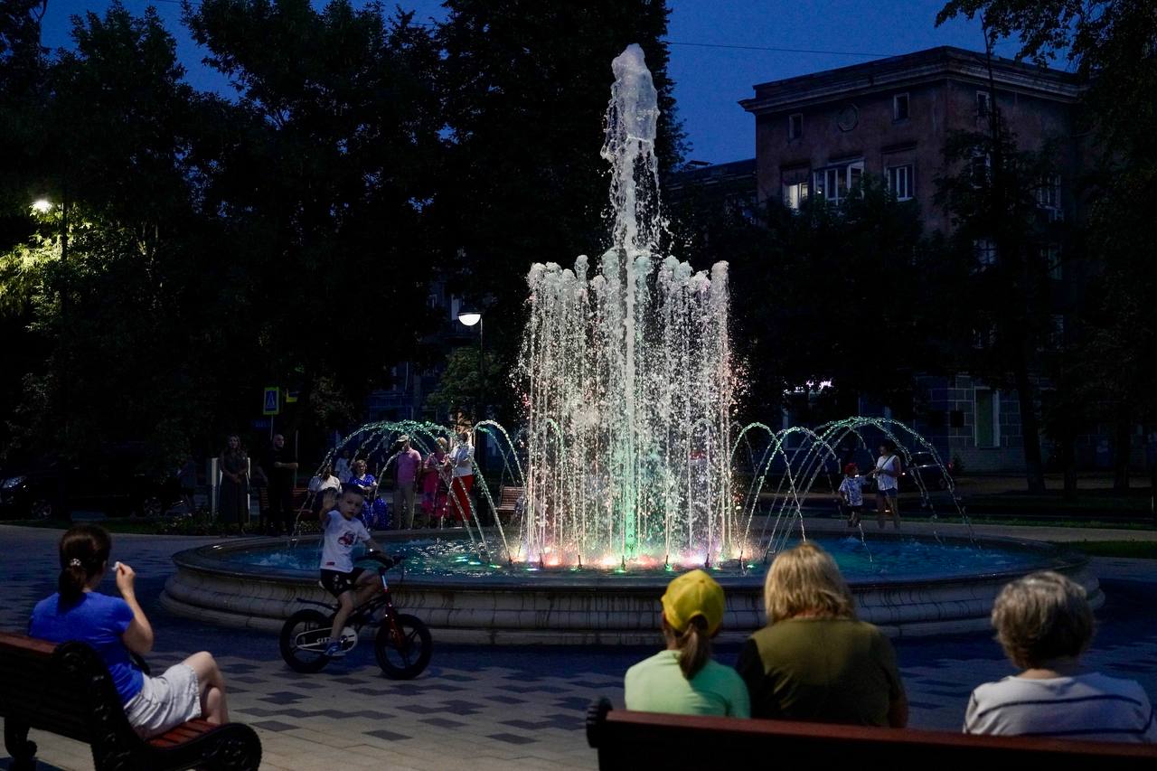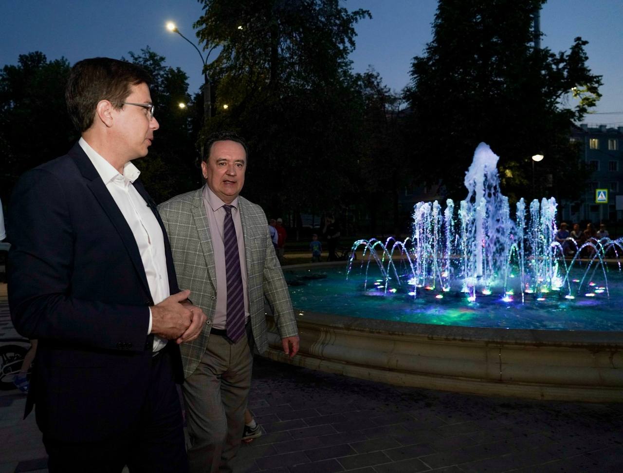 Юрий Шалабаев отметил, что специально приехал в сквер вечером, чтобы посмотреть, как работает обновлённый фонтан с подсветкой: «Здесь несколько режимов, которые предусмотрел подрядчик. Они включаются с периодичностью около полутора минут. Динамичная подсветка и струи высотой до 4 метров. С местными жителями поговорил, всем очень нравится».