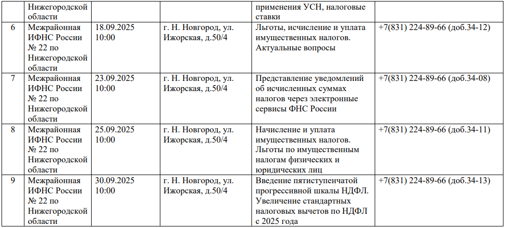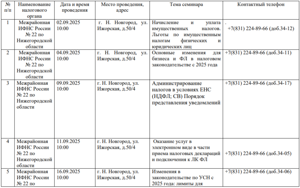 В сентябре 2025 года в здании межрайонной ИФНС России №22 по Нижегородской области пройдут семинары для налогоплательщиков по изменениям налогового законодательства, актуальным вопросам налогооблажения, в том числе по вопросам ведения единого налогового счета: