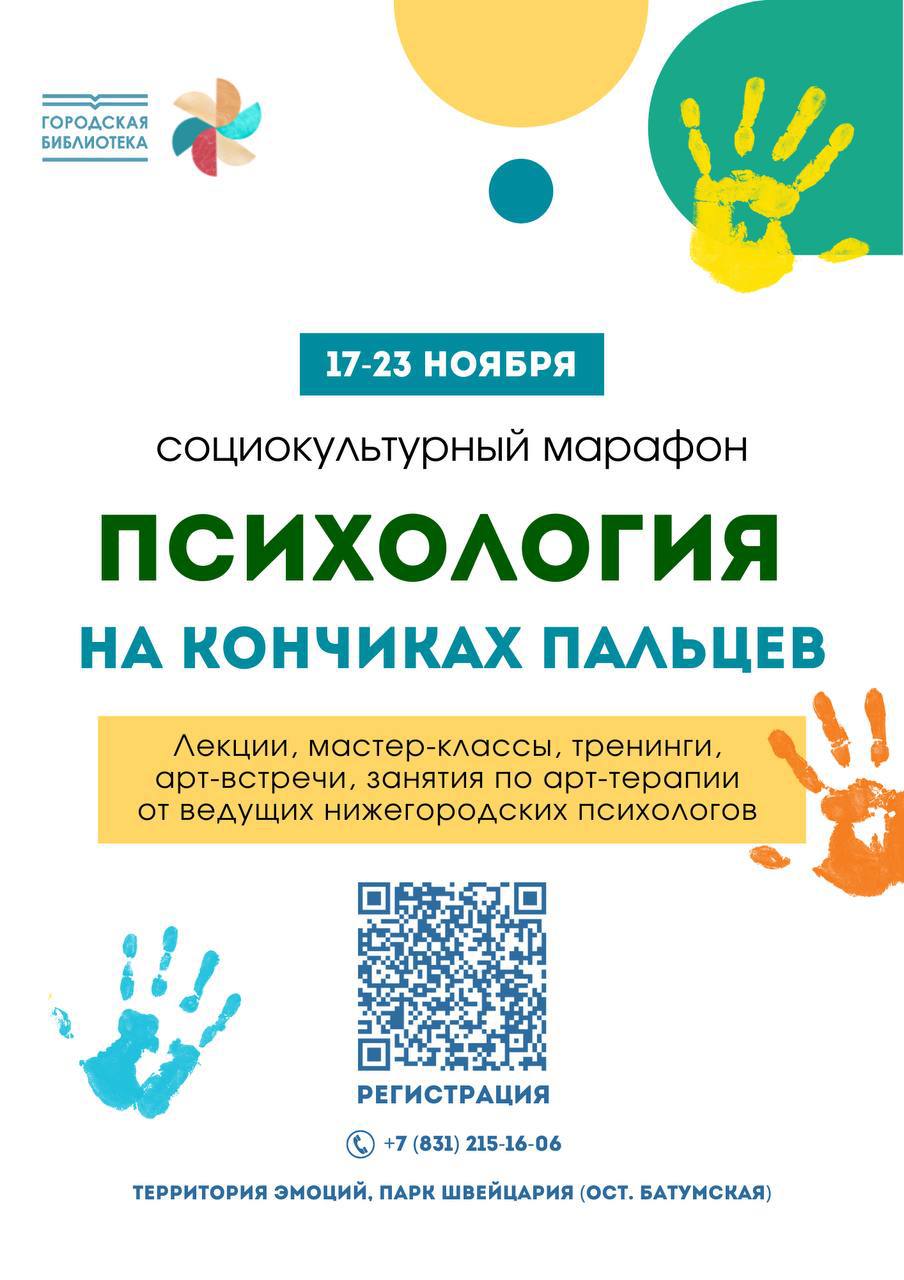 Лекции, мастер-классы, арт-встречи, тренинги и занятия от ведущих психологов и экспертов: филиал Центральной городской библиотеки имени В.И. Ленина – «Территория эмоций» приглашает нижегородцев и гостей города принять участие в социокультурном марафоне «Психология на кончиках пальцев» в рамках ежегодной Недели психологии. Как рассказали в департаменте культуры, в этом году она пройдет с 17 по 23 ноября.