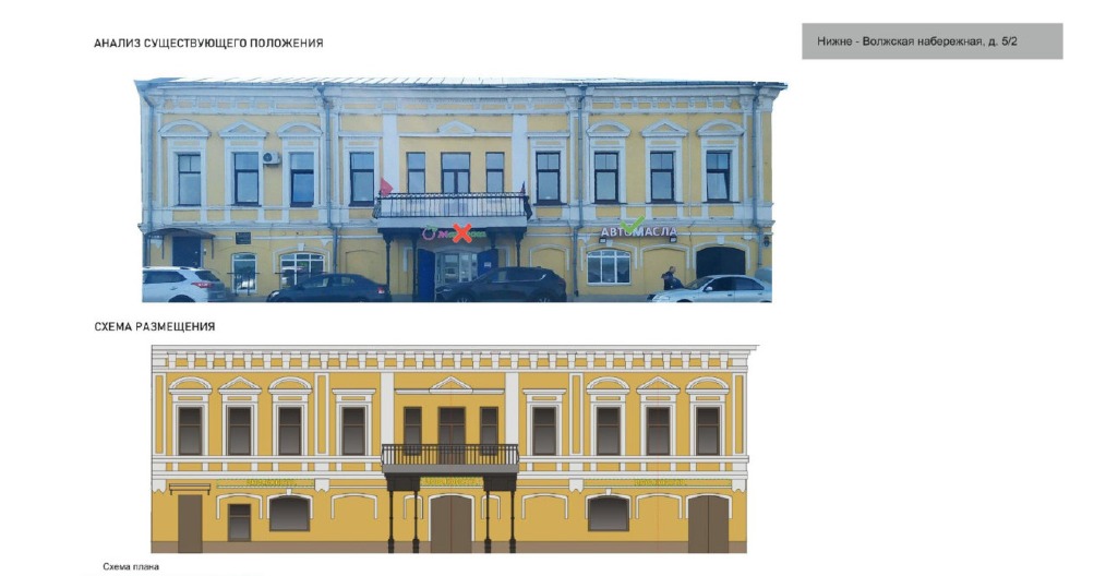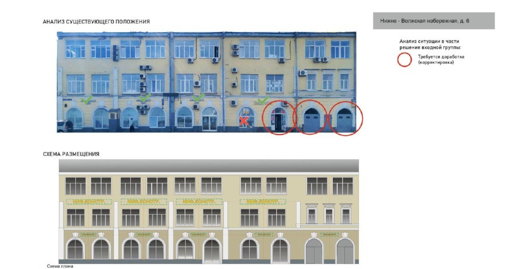 В архитектурно-художественной концепции Нижне-Волжской набережной предусмотрены требования к входным группам. Навесы и козырьки требуется располагать на одной оси со входами в здание, непосредственно над ними. В рамках одного здания все козырьки должны иметь одинаковый внешний облик: геометрию, габариты и материалы исполнения. При этом запрещается оборудовать существующие объекты дополнительными элементами и устройствами, нарушающими их декоративное решение и внешний вид, и закрывать декоративные, архитектурные и художественные элементы фасада здания. Также необходимо использовать один тип дверей в рамках одного фасада здания: единый тип отделки, цвет, процент остекления. На первом этаже рекомендуется использовать светопрозрачные входные двери.