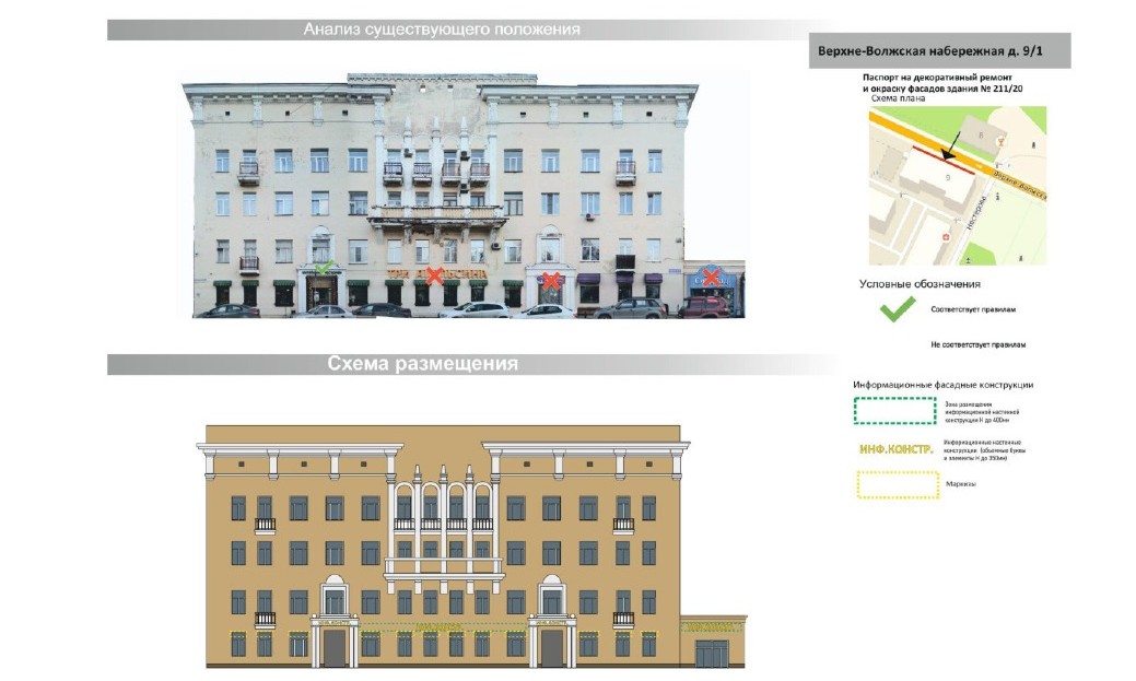 Как указано в концепциях, для уменьшения визуального шума на набережных вводятся ограничения по цветовому оформлению информационных конструкций. Их цветовая гамма должна быть единой в пределах фасадов одного здания и соответствовать его колористическому решению и стилистике. Допускается размещение графической части информационных логотипов в виде товарного знака или знака обслуживания в цветовой гамме, согласно регистрации в Федеральной службе интеллектуальной собственности (Роспатенте).