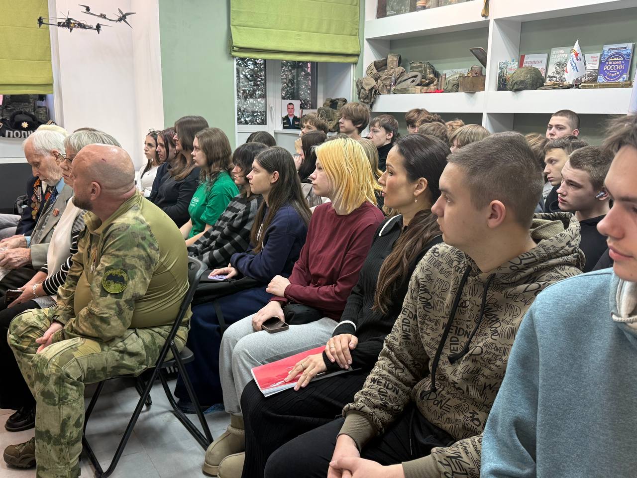 Житель блокадного Ленинграда Владимир Михайлович Абрамов прочитал ребятам авторские стихи о военных временах и подарил свою книгу патриотическому пространству.