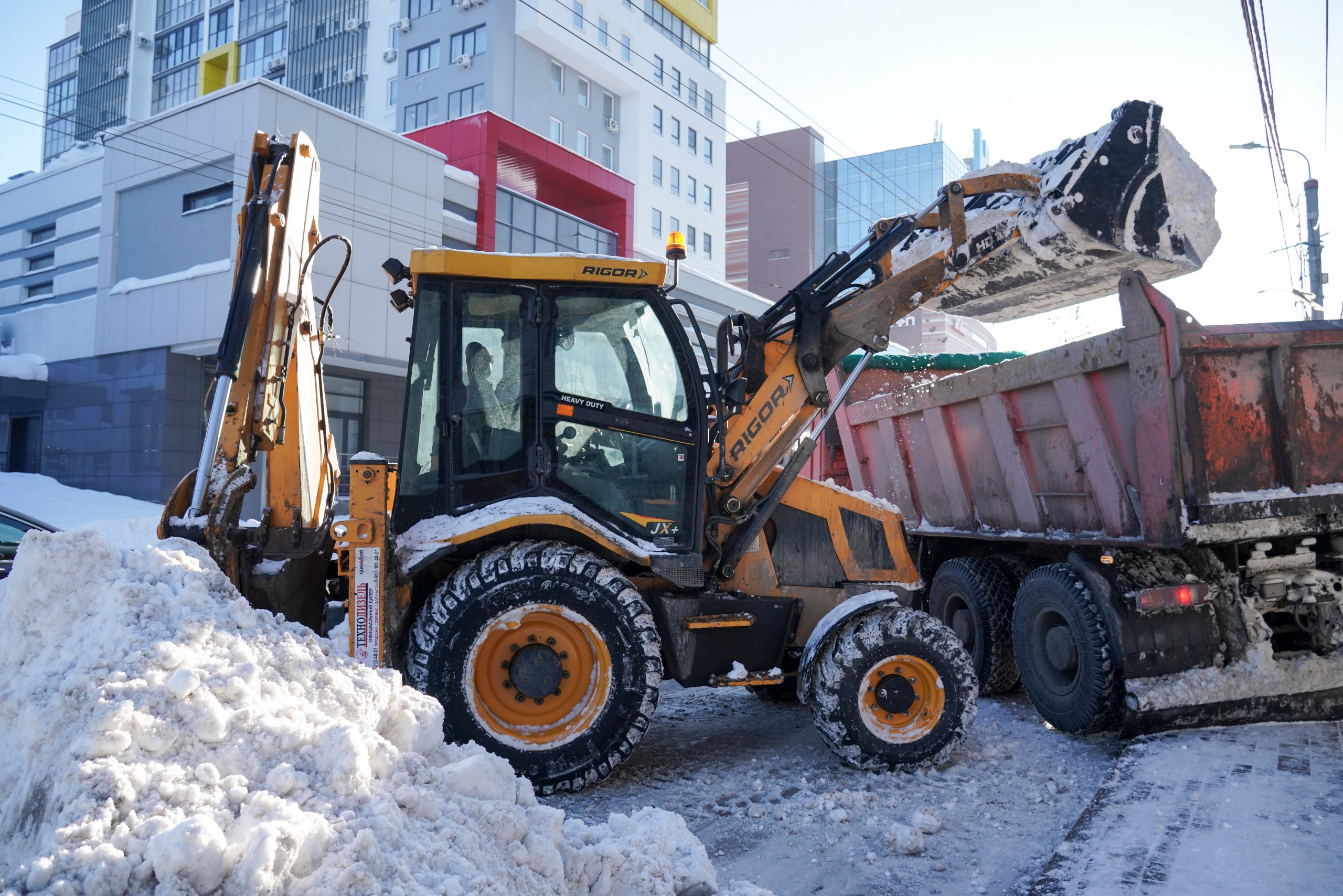Как рассказал прораб МБУ «Центр» Алексей Кадочкин, работы по вывозу снега ведутся круглосуточно, в три смены. «Выводим на улицу большое количество техники ежедневно, чтобы вывезти максимальное количество снега. Когда работаем ночью, конечно, вывозим его больше. Днем приходится работать в достаточно сложных условиях, потому что дороги для уборки целиком не перекрываем, нашим водителям приходится лавировать между машинами и автобусами», - сказал Алексей Кадочкин.