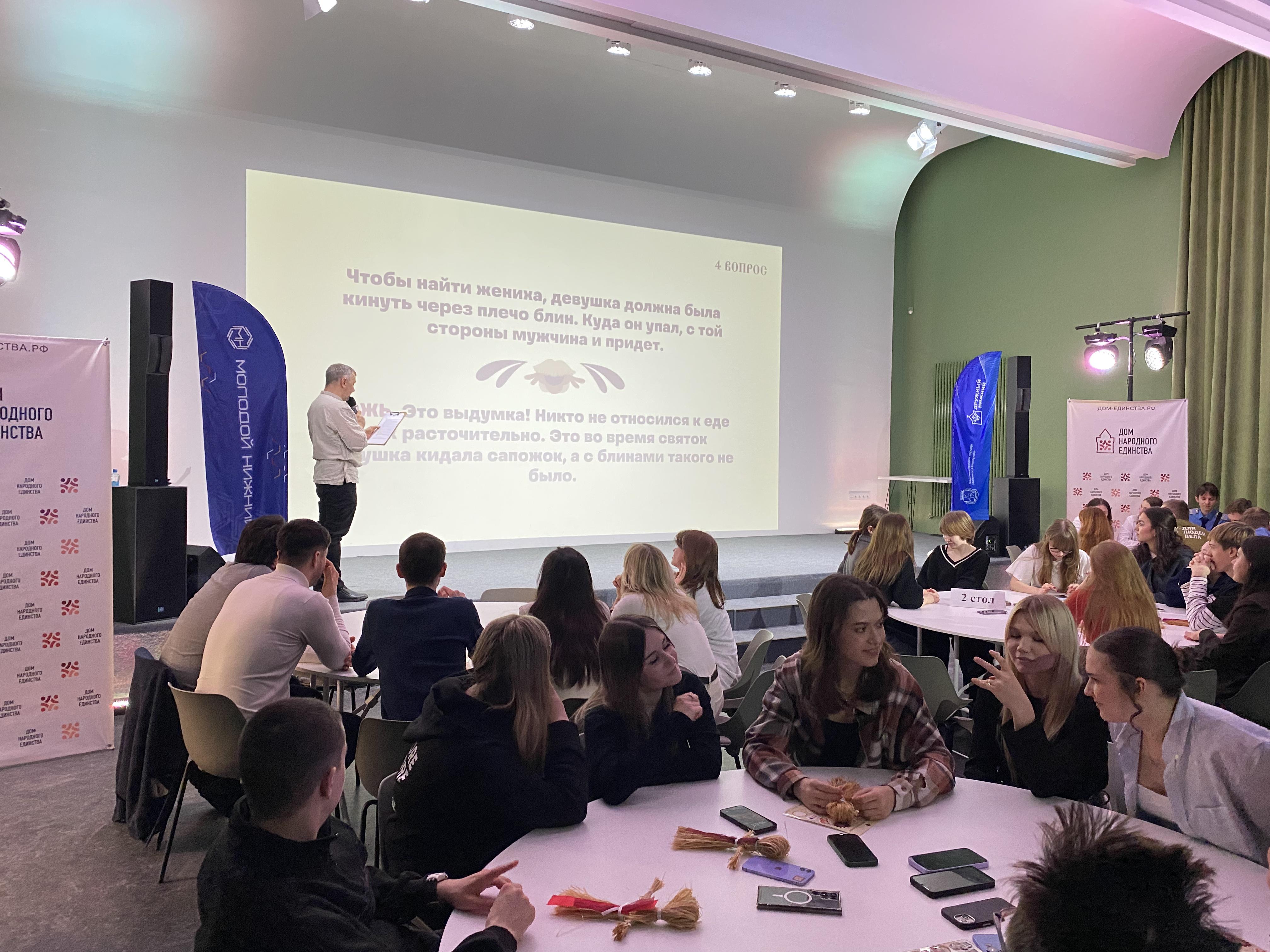 Кроме того, команды из российских и иностранных студентов ведущих нижегородских вузов собрались в Доме народного единства, чтобы выяснить, кто лучше знает историю и традиции Масленицы. «Нам было очень интересно принять участие в проекте. При подготовке мероприятий мы внимательно изучали множество литературы о праздновании Масленицы, чтобы максимально точно передать ее колорит. Мне кажется, нам удалось воссоздать атмосферу веселья и тепла, характерную для этого яркого события, и заинтересовать других ребят, в том числе иностранцев. Праздник прошел очень весело и вкусно, все остались довольны!» – рассказала член Городского студенческого совета Анастасия Гусева, участвовавшая в организации праздника.
