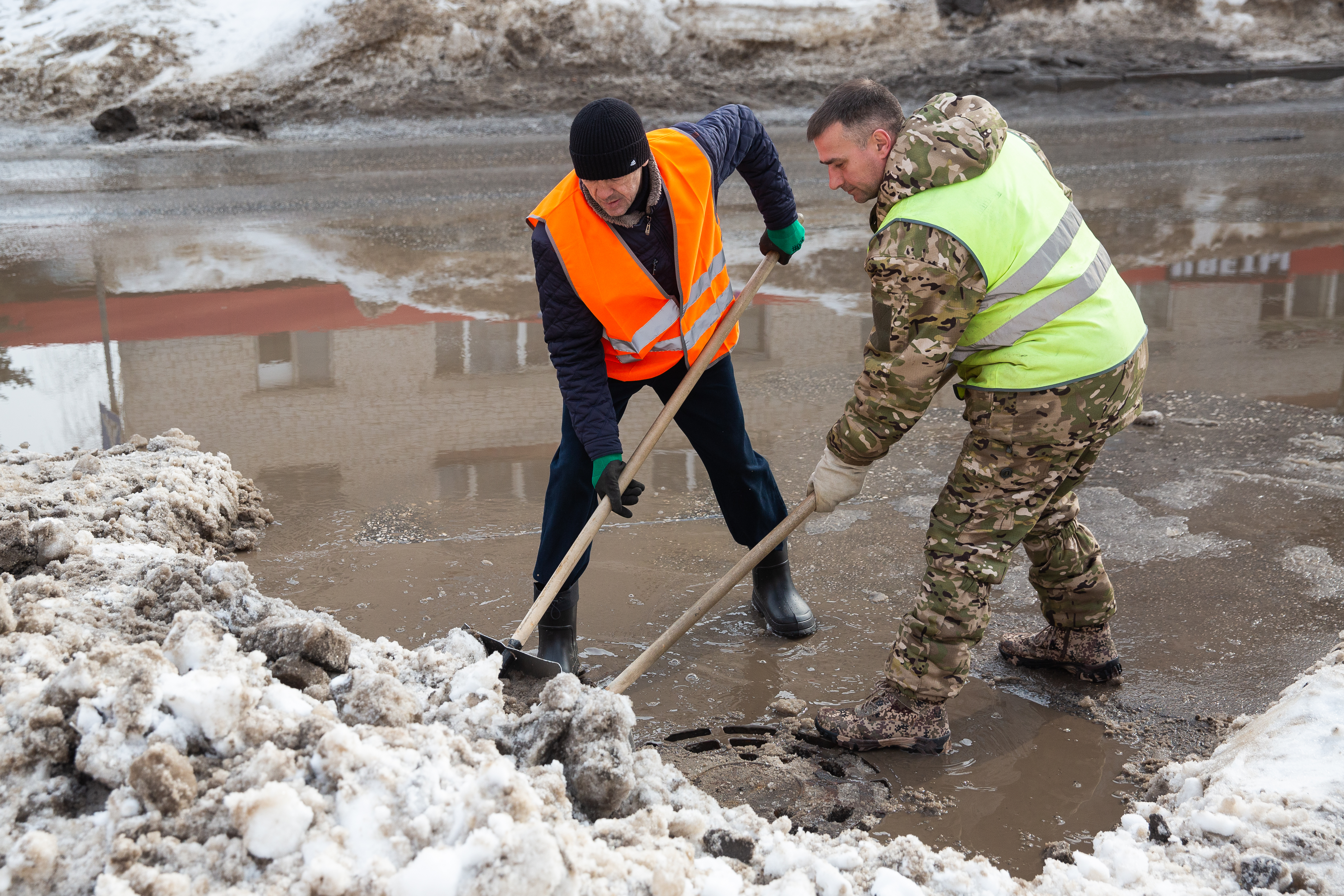 Заместитель директора МБУ «РЭД» Алексей Солнцев доложил главе района, что на откачке воды у них работает 4 единицы техники круглосуточно, на расчистке территорий от наледи – 9 единиц тяжёлой техники, на вывозе снега – 12 самосвалов. Так, бригада прораба МБУ «РЭД» Максима Баженова трудится в круглосуточном режиме. «Мы занимаемся откачкой воды и прочисткой дождеприемных колодцев. Все проблемные участки мы знаем, следим за ними и стараемся оперативно выезжать на откачку. Сегодня, например, откачиваем воду на проезде у дома №25 по улице Челюскинцев. В этом году мы собираемся системно решить эту проблему, установив дождеприемный колодец и подключив его к ливневой канализации», - рассказал он, добавив, что пока машина занята откачкой, рабочие рыхлят и ворошат снег, а также чистят дорожки от наледи.