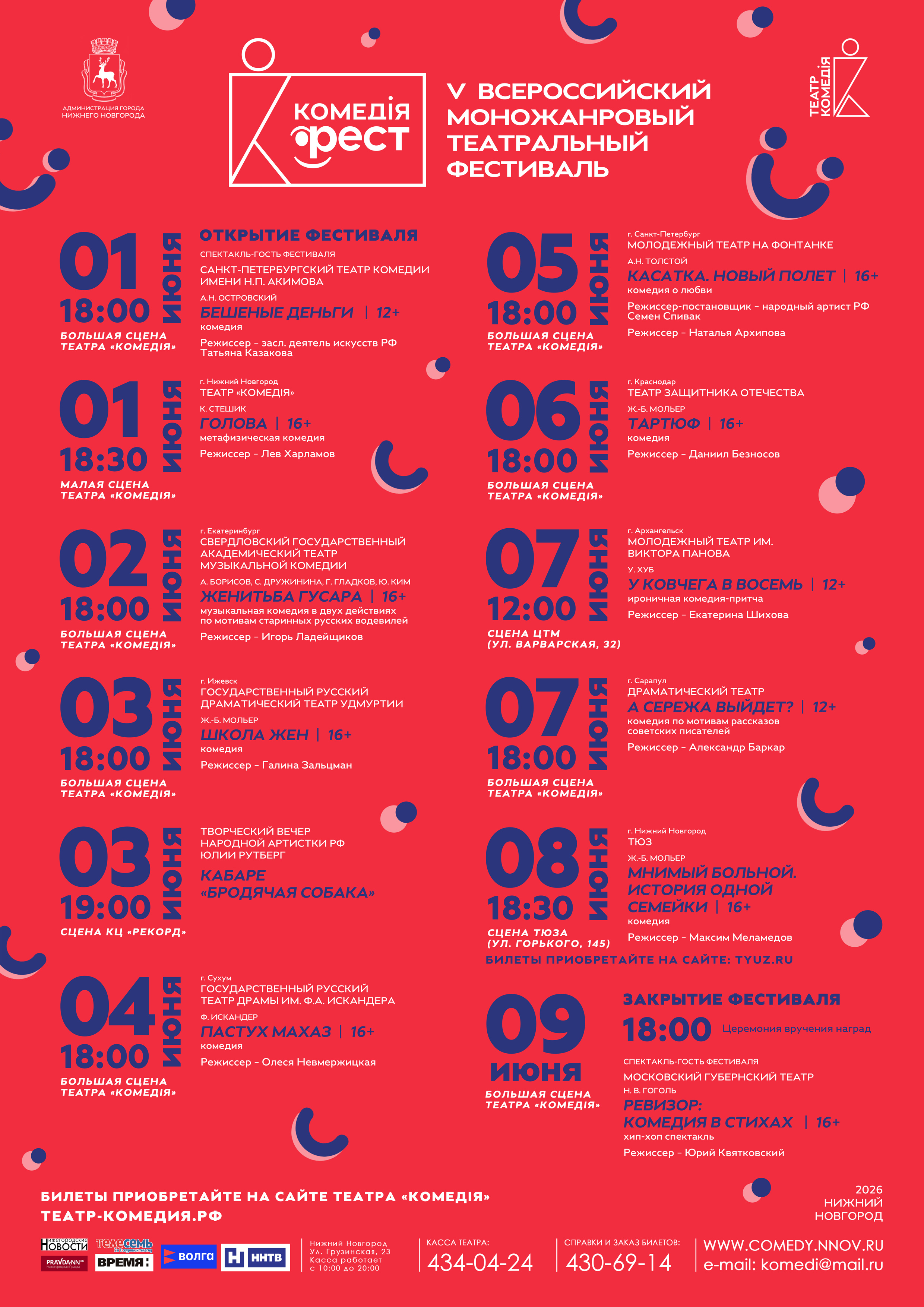 «Фестиваль традиционно представит яркие постановки комедийного жанра как именитых, так и еще молодых театров со всей России, а также театра из Абхазии. Из 20 городов заявки на участие были присланы впервые, в том числе из городов Беларуси, Казахстана и Узбекистана. Событие откроет Санкт-Петербургский театр Комедии имени Н.П. Акимова со спектаклем «Бешеные деньги». Это тот самый легендарный театр, который в 1947 году послужил образцом для создания Горьковского театра комедии. А на закрытии фестиваля зрители увидят нашумевшую премьеру Московского Губернского театра – хип-хоп комедию в стихах «Ревизор», – написал Юрий Шалабаев, отметив, что специальным гостем «Комедiя-ФЕСТ» станет народная артистка России Юлия Рутберг.