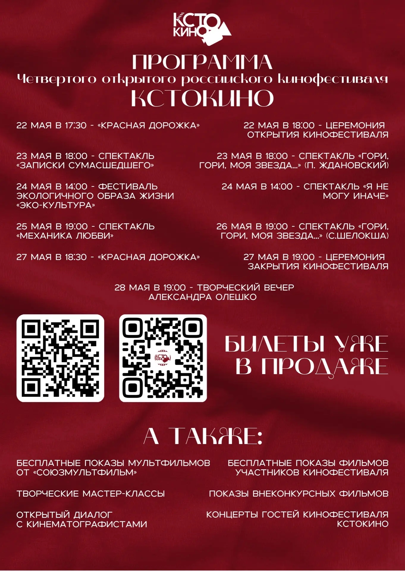 26 мая в Музее кинематографии в Кстово на площади Ленина в 12.00 состоится открытый диалог с кинематографистами, в 14.00 в павильоне «Vместе» пройдет мастер-класс по актерскому мастерству, а в кинотеатре «Империя грёз» в 14.00, 17.00, 19.00 продолжатся показы конкурсных фильмов. В 19.00 концертная программа пройдет в Доме культуры п. Ждановский, а в это же время в Доме культуры с. Шелокша зрители вновь смогут увидеть моноспектакль «Гори, гори, моя звезда…».