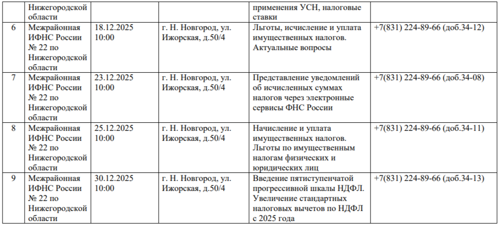 В декабре 2025 года в здании межрайонной ИФНС России №22 по Нижегородской области пройдут семинары для налогоплательщиков по изменениям налогового законодательства, актуальным вопросам налогооблажения, в том числе по вопросам ведения единого налогового счета: